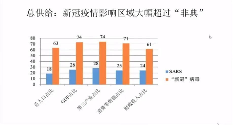 影响总人口占比非典才18%,这次是63%;GDP比重,非典时期才影响26%,这是占到74%;零售消费额的比例,非典时期只占25%,这次影响71%。所以它是整个供给面的一个大规模的受到了影响。