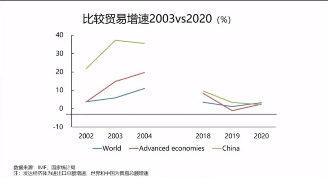 所以大家可以看到,在外部的环境,我国家加入WTO以后,贸易的增长也是很快,所以我国整个贸易的增长也是从增长从2002年的22涨到了2003年的36,涨得非常快。现在的情况呢?大家可以看到,世界贸易的增长从3.6降到1.1,今年可能会略有上升,到2%左右。