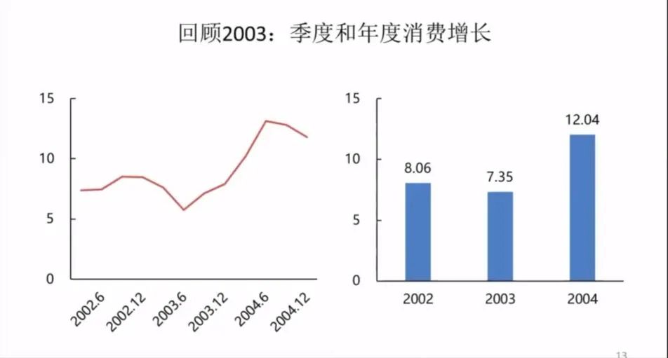 比如说你两个月你很少上餐厅去吃饭,你不能说疫情解散以后,你去餐厅去吃无数的饭,把这个补回来。你也会去,也会去多一点。但是很难把过去的消费完全补回来。所以2003年的消费增长反而是低于2002年的,但是2004年继续保持了一个强劲的增长12.4%,因为打下了这个基础。