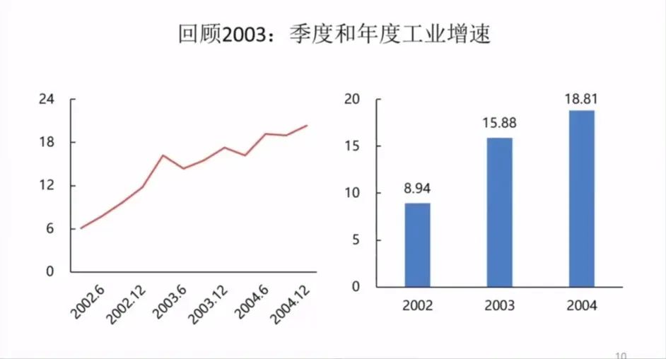 所以我们把这几个数据放在一起看,疫情在2003年有一个强劲的反弹。消费是一个比较困难的方面,靠投资、靠房地产、靠贸易,整个拉动。所以使得整个2003年经济继续增长,比2002年持平还继续增长。