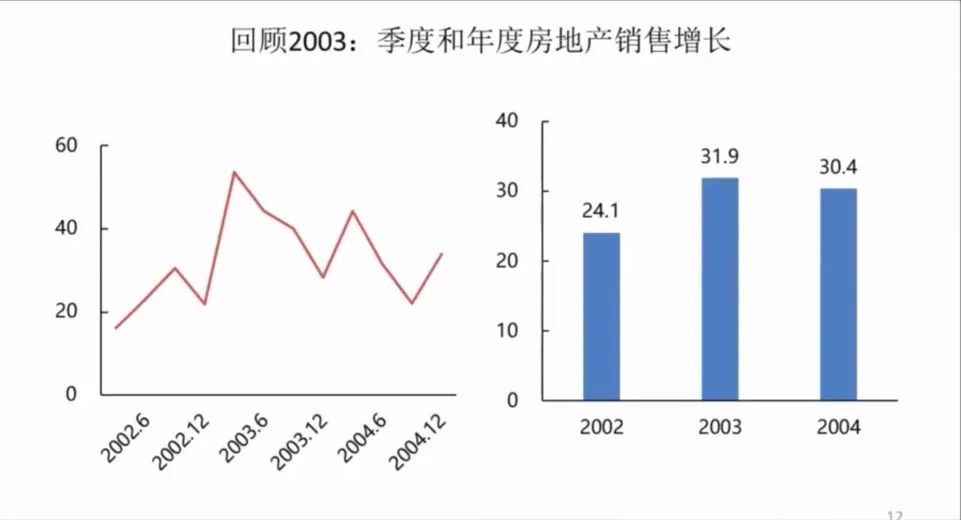 从年度的房地产销售数据中,大家可以看到,它有一个很大的下跌,但是之后就开始反弹,反弹还是很强劲。从2002年的24.1上升了2003年的31.9%,延续到2004年的30%。所以大家可以看到几个轮子,投资、贸易、房地产,2003年整个的反弹都是非常强劲。
