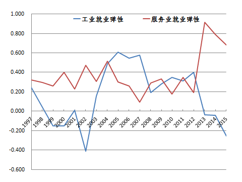 为什么服务业的就业弹性系数魔法似地突然跳上去了?如果不是短期的强就业促进政策的推动,我看不出还有什么原因可以解释它。国家统计局给出的就业增长率在制造业和服务业两个部门的变化趋势也能说明一些问题。过去这几年,服务业的就业增长率已经远远领先于制造业了,而在6年前,制造业的就业增长率还远远高于服务业。但是这几年,特别是2012年以后,政府的就业促进政策发力,服务业的就业才开始加速增长。
