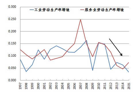 虽说在经济增速持续下行的时候就业没有出太大的问题,但这在很大程度上是政策的结果,并不是因为服务业为了自身劳动生产率的扩张需要而产生了对大规模就业的快速需求。事实上,如果是后者,我们应该可以计算得到服务业的劳动生产率在这几年就业扩张期间应该表现出持续的改善和提升的趋势。不幸的是,情况并非如此。我们用国家统计局的数据计算得到的结果恰恰相反。我们整体服务业的劳动生产率增速根本没有上升,反而是在持续的恶化。