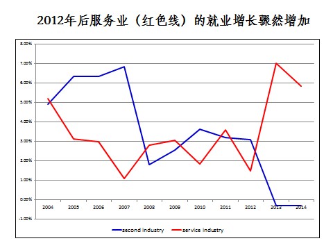 尽管我们现在没有很微观的数据,但如果我们把金融、银行、保险、教育,通信产业,信息产业等现代服务业拿掉,大概可以把剩余的看作中低端的服务业。按照这个口径来计算就业的增长,我们就会看到,2012年以后,中低端服务业吸纳的就业不可思议地在扩张。