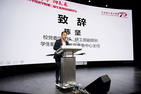 随后,校党委学生工作部、研究生工作部副部长、学生职业发展教育服务中心主任陈坚老师发表了讲话。陈主任说到,经院生涯教育服务一直秉持“重开拓、重引领、重创新、重服务”的工作理念,关注和思考如何让毕业生好就业、就好业、迈向走向社会的第一步。陈主任特别指出,中国内部区域发展和中国在参与全球治理的过程中都需要复旦学生,我们要加强校、企业、校友的联系,给复旦的学生提供更多的提供职业发展的机会,实现新时代职业发展体系的构建,让国家社会学生满意。
