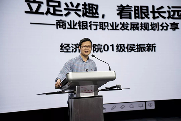 中信银行总行资管中心处长侯振新先生发表了主题为《主足兴趣,着眼长远——商业银行职业发展规划》的演讲。侯先生首先通过分享自身11年在商业银行的工作经历,提出了兴趣是最好的老师——“996”不是关键,工作快乐与否不仅是与时间相关,更是看自己是否喜欢,兴趣会激发精力体力去做某一件事。随后,在商业银行职业发展规划方面,他介绍了商业银行的主要业务、组织架构和工作特点。最后,侯先生提出了3个注意事项:认真做好第一件事、超出别人预期(尤其是时间管理预期),不断学习、打下基础,和认真思考、相信长期的力量。