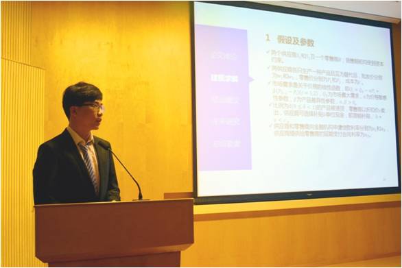 首先报告的是来自南京大学的马宁同学,论文题目《延期支付合同在供应链竞争环境下的表现》,引发老师们的热烈讨论。马宁同学在中小企业融资困难的问题制约着供应链发展,供应链金融本身为中小企业提供了融资渠道的情况下开展了研究。通过研究核心企业提供延期支付合同给下游中小企业,马宁同学发现双方延期支付合同可以提高供应链各主体利润及供应链整体竞争力,而供应商提供滞销补贴对供应链没有提高作用。韦潇老师提出了解释结论图表中的经济学直觉,以及需求非线性化后是否成立的问题,马宁同学一一给出解答。唐老师则指出了一些不足之处:在现实中,银行给中小企业的授信价格比金融机构低,融资困难其实是歧视引起的,与论文中中小企业不选择银行的原因是高利率相悖。