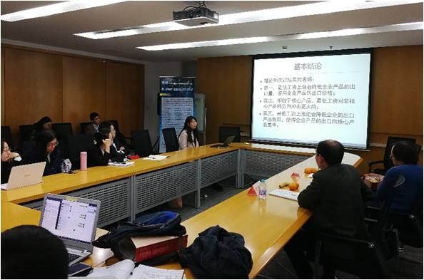 随后,赵瑞丽博士进行论文汇报,题目为《最低工资、产品排序与多产品出口企业的行为调整》。论文区分了单产品出口企业和多产品出口企业的行为差异,阐述了最低工资如何影响出口企业内部产品调整,并通过实证发现最低工资上涨对企业出口行为会产生一定的负向冲击。老师关于出口向核心产品集中的结论提出疑问,认为可能是因为最低工资上升抑制了企业研发,同时老师还建议进一步巩固计量的可靠性,例如对内生性来源和固定效应设定进行思考和补充。