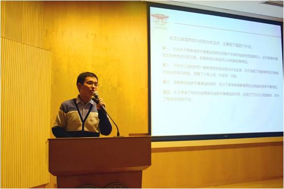 第四位报告的是来自上海财经大学的李立同学,论文题目《家庭劳动力供给对消费平滑的影响效应——基于CFPS数据的微观实证》。论文借鉴Blundell et al(2016)的分析框架,将工资收入冲击、劳动供给以及家庭消费三者之间的联系囊括在一个双薪家庭生命周期模型里面,通过运用对数线性化等技术推导,求解上述家庭效用最优化问题,得到消费、劳动时间以及工资收入冲击的动态关系。结果表明,家庭劳动力供给能够有效地弥补由于工资冲击而产生的消费波动。在提问环节中,朱宏飞老师就如何区分是否是暂时性和长期冲击提出了问题,并指出了论文中弗里希弹性矩估算没有误差项的不足之处。韦潇老师则给出了效用函数在考虑夫妻单一决策的同时还要考虑集体决策的建议。李立表示老师的建议非常有启发性,会继续深入分析。