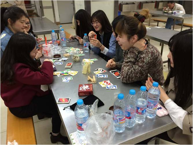 逛着逛着,大家也累了,就去食堂坐着玩会棋牌类游戏吧。几把UNO下来,大家对彼此的了解更加深入,聊得更high了。我们和东华大学的同仁们不仅在工作经验上有诸多交流,还向他们展示了复旦的好风光,在游戏中提升革命友谊,共同度过了充实而快乐的下午!