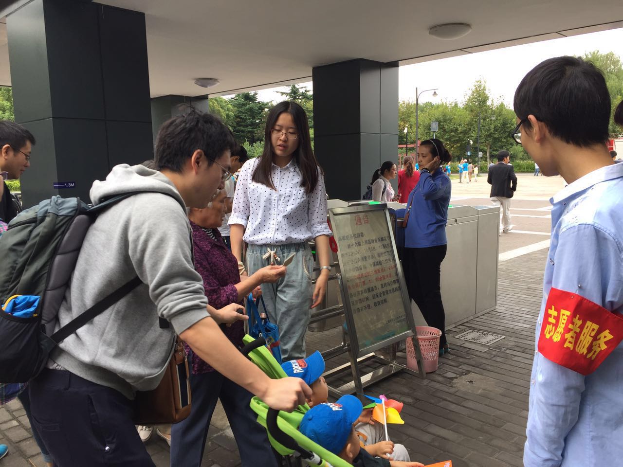 周扬、章恒飞等四名同学在7号门帮助检票人员维护秩序,胡思静等三名同学与付逸麟等三名同学分别在1号门与2号门维持秩序。主要的工作有:疏散游客进入人较少的检票口、提醒携带手推车等大型物件的游客从特殊通道走、解答游客关于持有二维码如何进园的问题以及为游客介绍周边交通路线。由于是国庆节,客流量非常大,志愿者们没有一刻休息,站在烈日下维持秩序,但他们没有丝毫怨言。由于客流得到疏散,检票人员的压力得到了很大减轻。