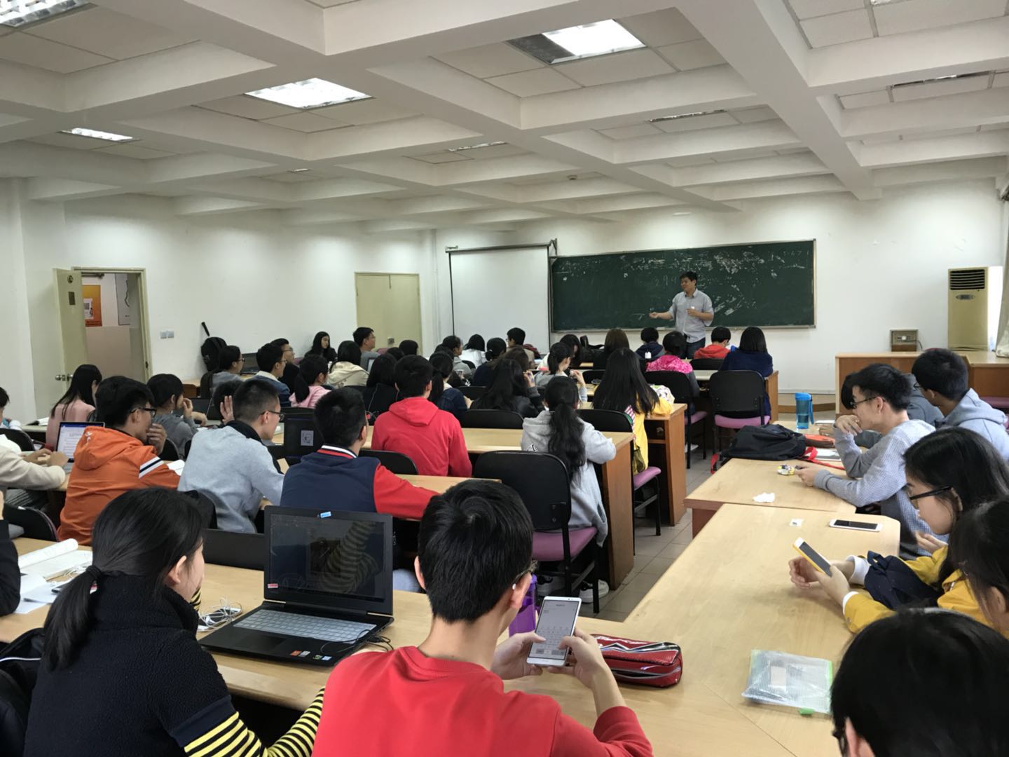 首先,老师带领各位学员进行了一轮简单全面而高效的粤语发音练习。老师重申了粤语的九声六调,并着重复习了六调。他巧妙地引入了音乐中音高的概念来类比粤语中的声调。这样即使是起伏,读音都相似的音调,也可以予以区分。作为一门语言的教学,它的教学方式相对原始。老师没讲一个单词,台下的学员便模仿他的发音,跟读一遍。为了保证同学们能最大限度的还原正确的发音,老师特意将自己的发音夸张化、标准化,从而使同学们即使准确度上打折扣也能基本做到字正腔圆。音调的纠正过程中,老师重点指出音调变化可能会带来的语义巨变。老师精心选取了令人印象深刻的例子,使得音调的重要性不言而喻,被铭记在每位同学的心中。