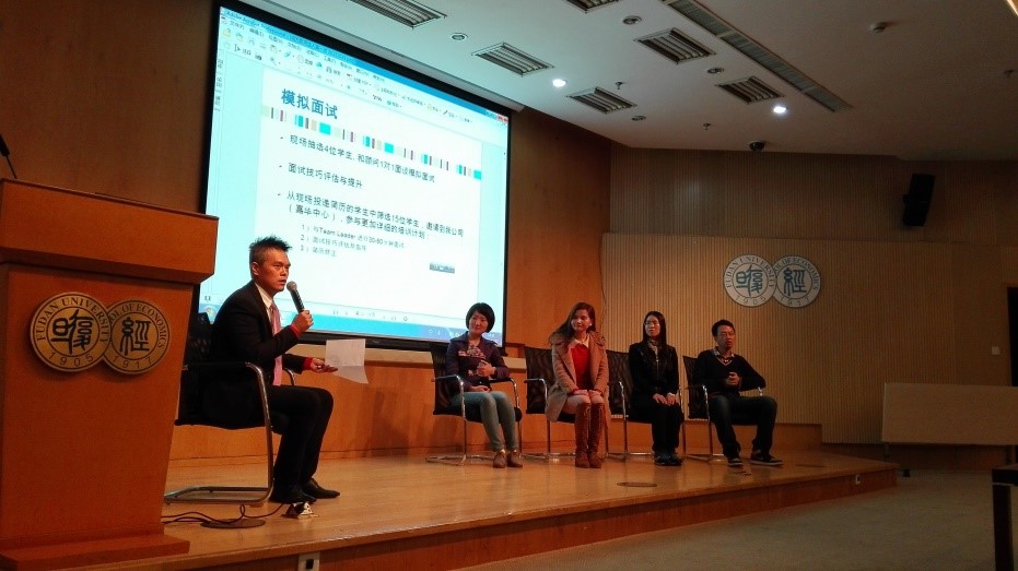在之后的模拟面试阶段,四位复旦学生与Kung进行了现场的模拟面试。第一位刘同学有着优异的学习成绩、优秀的英语水平,也拥有较丰富的比赛经历和实习经历,面试的自我介绍自信而流利。Kung针对她的表现指出,在说明取得的成绩时最好给出平均水平的数据,这样更能突出自己优于其他人的能力,应聘财务管理相关岗位时则要凸显自己的专业知识和能力。第二位张同学在本科担任班长,自我介绍时着力讲述了组织一次班级晚会的经历,想要面试金融保险相关的职位,但在提问环节回答Kung提出的与职业相关的专业问题时表现略有欠缺。Kung在点评时指出,在面试专业性强的职位时应该掌握充分的专业知识以给面试者留下良好的印象。沟通表达能力、领导能力固然重要,专业能力也是必不可少的。第三位李同学今年刚刚大三,实习经历不足所以相比前两位高年级同学表现略有不足。另外,刘同学虽然来自数学系但是想应聘金融、会计相关的职位,Kung就专门问了她对相关行业的认识,使刘同学和在场的其他同学意识到了即使大学专业和应聘职位并不对口,在面试前对应聘岗位所在的整个行业乃至相关行业有明确的认识和足够的知识储备是非常有必要的。