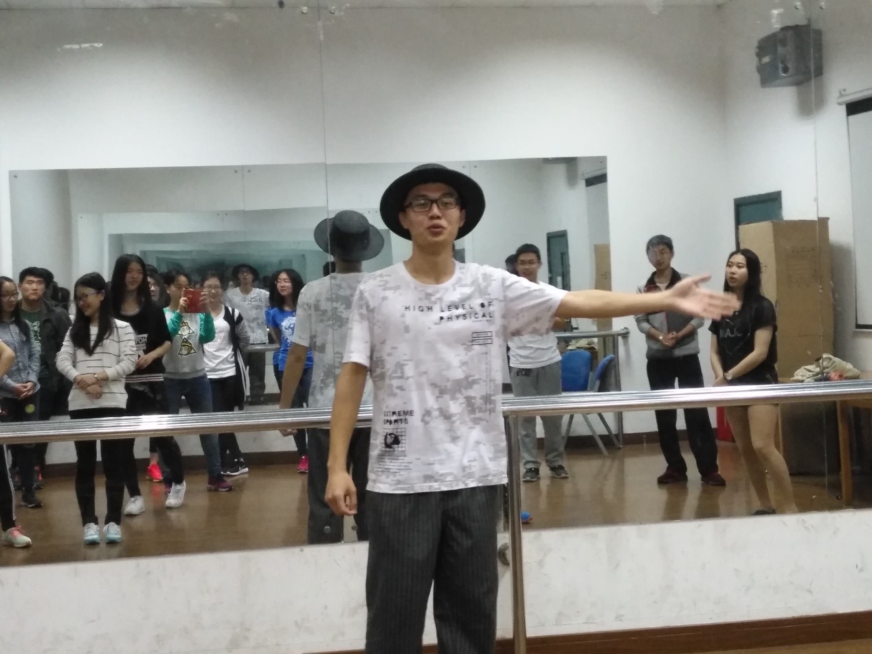 最初来到舞蹈房时学员们都有些陌生和拘谨,不过很快助教的一段waacking表演便激起了同学们学习的热情。伴着背景音乐有力的节拍,老师首先为学员们介绍了街舞中的“文学常识”及起源。街舞可以分为old school和new school两种,它的style有hip-hop, hopping, breaking, jazz等等,其中Hip-hop是本次课程教学的主要内容。