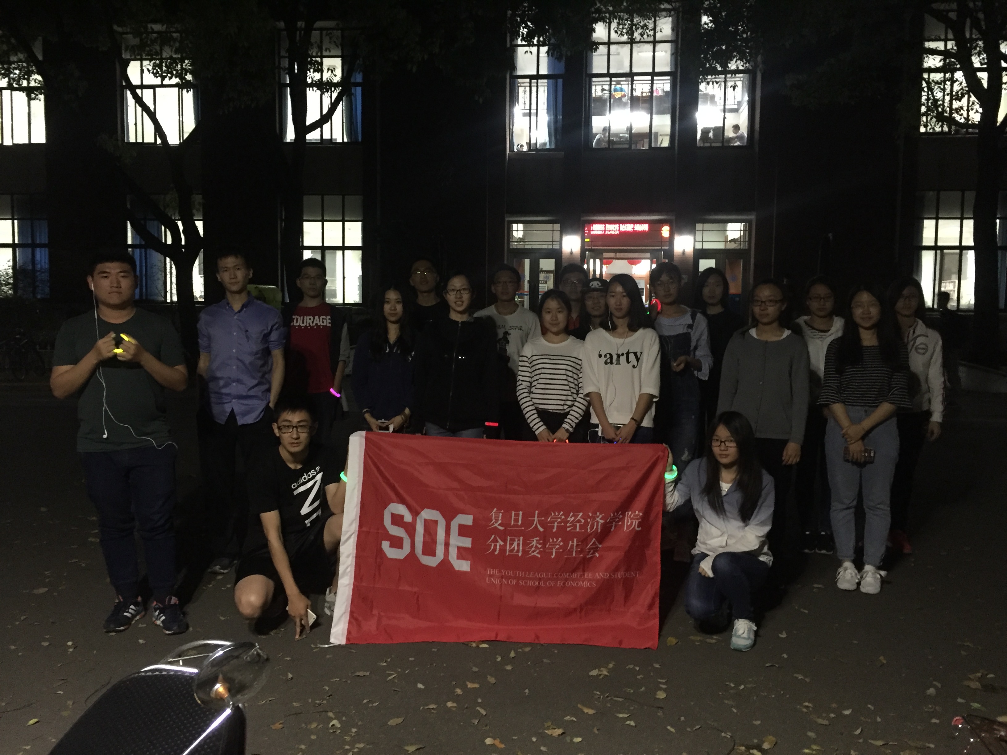 负责本次活动的学长早早地就搬着一箱水来到理科图书馆门口等待,学员们陆续到场并领取了荧光手环,五颜六色的手环在夜色中呈现出别样的光彩。人员聚齐之后学长带着大家做了准备活动,简单基础的热身运动帮助大家活动开了四肢,避免在运动过程中因热身不足可能会造成的损伤。很快,大家热身结束,整装待发,本次乐跑活动也就正式开始了。