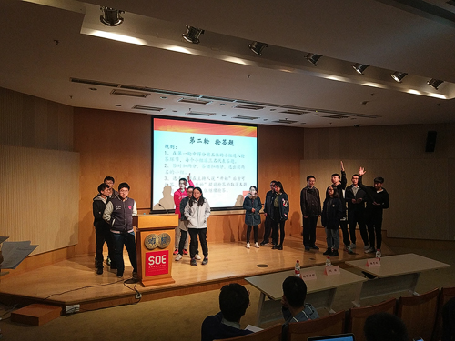 首先主持人宣布了知识竞赛的比赛规则:共两轮比赛,第一轮为必答赛,每组小组依次上台,每人轮流回答一题,答对得一分,答错不扣分,第一轮过后将计算各组的总得分。两轮得分前五的小组进入下一轮;第二轮为抢答赛,各个小组派三名代表参加,总计50道题。抢答选手举手并得到主持人的允许后方可回答问题,答对一道计得两分,答错倒扣两分。第二轮过后将计算各组前两轮的总得分,决出最后的优胜小组。