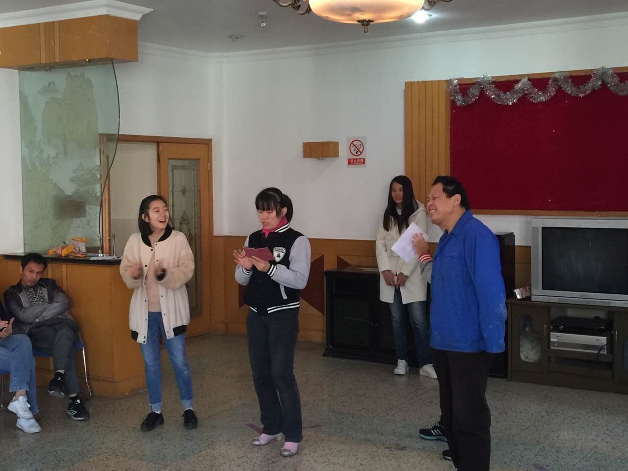 紧接着是第二个部分:你演我猜。这是考验学员肢体表达能力和默契的一个游戏。由一位学员想一个物品,然后上台表演,不能发出声音,只可依靠肢体动作来让其他人猜测自己表演的是什么。如果猜出则由下一个人上台,游戏继续,猜不出则需要在台上朗读一个绕口令。游戏将学员们从遥远的的历史中拉回来,极大地活跃了现场气氛,学员们都玩得非常高兴。而成功被猜出和猜对的同学都获得了奖品——精美的手环,看着他们开心的模样,志愿者们也不自觉地笑了起来。而没有猜出的学员则在大家的鼓励下大声地背诵了静夜思,获得了一致的掌声。