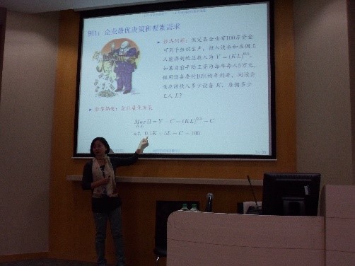 在沙龙的开始,樊老师首先举了几个经济学中运用数学解决的例子,包括企业最优决策和要素需求、个人最优决策和消费需求、不确定情况下的最优化与投资组合以及博弈论问题。直观形象的例子,加上樊老师仔细清楚的讲解,使在场同学都对数学知识如何运用到经济问题有了初步的了解。