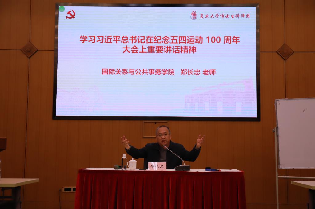 接着,国际关系与公共事务学院郑长忠老师对习近平总书记在纪念五四运动100周年大会上重要讲话精神进行了解读。习近平总书记的讲话主要围绕三个方面对新青年使命作出阐述;对实现价值的方面使命即主题方向的使命;进入新时代后,中国青年要有教育家国情怀,人类关怀;在促进中国发展的同时,还要为共建人类命运共同体做贡献。习近平总书记的措辞通俗易懂,细细琢磨后还能品出更深一层的意味。中华民族在文明衰败之后,要重新站起来,走向新的未来。一代人有一代人的使命,我们这一代人应把中华民族伟大复兴的接力棒接下,主动承担起社会主义现代化建设的担子,投身于中国民族的伟大复兴,做新时代的新青年。
