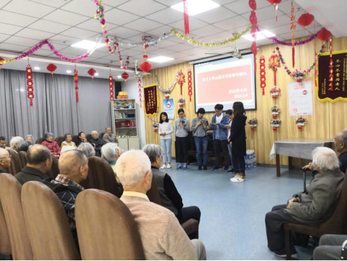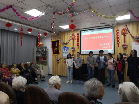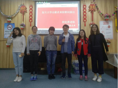 上午9:10,九位志愿者组成志愿者团队,在南区食堂门口集合,一同出发前往世纪养老院。复旦的志愿者已经是世纪养老院的常客了,这一次他们给老人们带来各式的节目,今天,老人们聚在一起,共同欣赏志愿者们的表演。