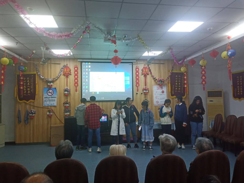 小组成员们到达养老院后,首先陪同大厅中的老人们谈话聊天,在轻松愉快的氛围下开始了节目表演。从《我和我的祖国》合唱到爱国主题诗朗诵,节目形式丰富多样,紧扣爱国主题,精彩纷呈,赢得老人的一致好评和喝彩,志愿活动在在老人们的欢笑声和鼓掌声中收尾。
