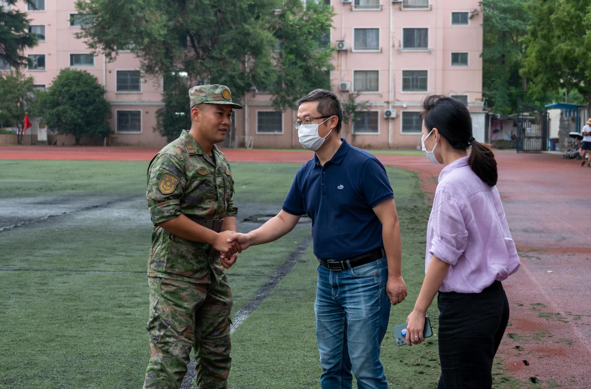 党委书记李粤江、副书记高舒等一行来到邯郸路体育场,看望慰问正在参训的2021级经院学生和相关承训教官。