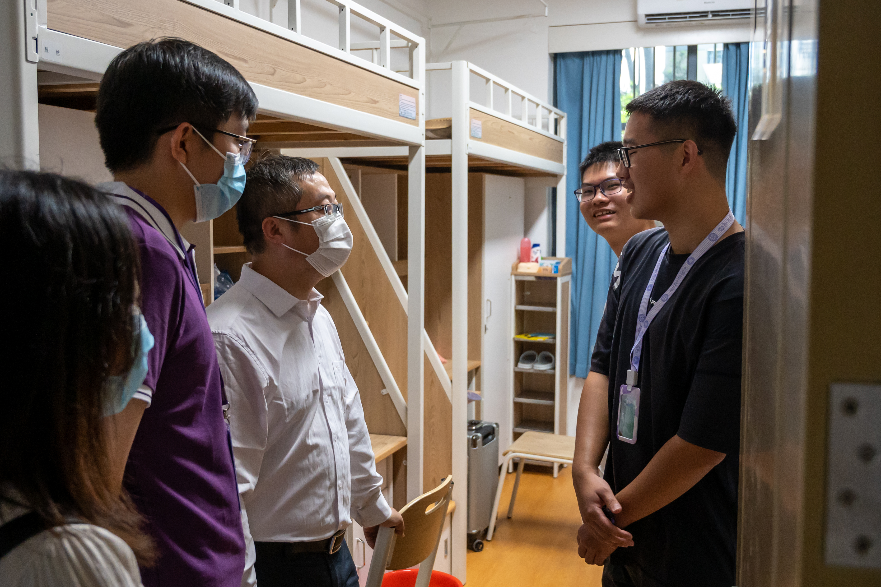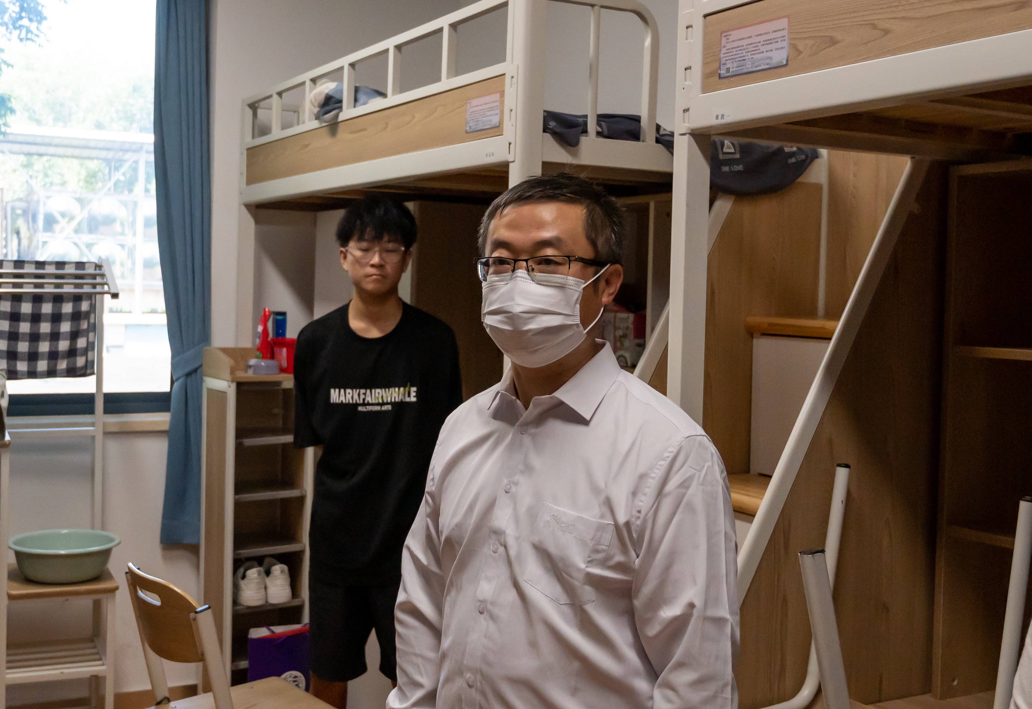 进入32号楼,党委书记李粤江、副书记高舒等首先进入101寝室,细心地观察到男生们都在擦汗,于是从上海的天气闷热聊起,谈到宿舍的空调安装问题,从细微之处关怀学生们的入学适应情况。其次,他们进入204寝室,男生们正在整理寝室,李粤记书记幽默地说道“要保持哦”。接着他们进入209寝室,书记先询问四位同学分别来自哪里 ,从地方特色美食开始拉起家常,提到了故乡,同学们都情不自禁地露出了笑容,有一位来自新疆的男生甚至拿出了书包里携带的酸奶疙瘩,书记忙摆手推辞了,最后,书记勉励大家在上海积极适应好好学习,学成后可以拿所学的知识、技能建设家乡。进入最后一个寝室——308寝室,同学们正要成群结队地出发前往正大体育馆西侧做核酸,响应杨浦区政府号召,落实防疫措施,见到书记,赶忙停下问好,书记欣慰地笑了,为复旦师生面对复起的疫情高度审慎、坚决打好本轮疫情防控歼灭战的态度点赞。