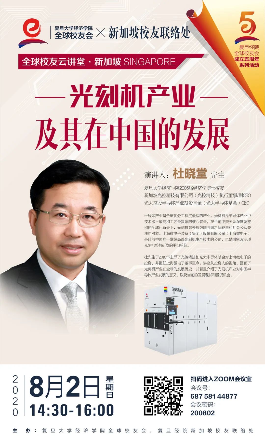 2020年8月2日,复旦经院全球校友云讲堂新加坡站——“光刻机产业及其在中国的发展”在ZOOM会议在线召开。本次云讲堂由御书屋