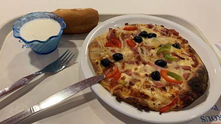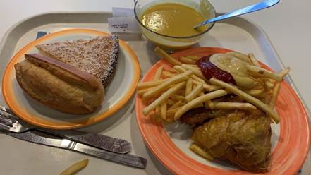 一楼食堂的味道其实倒只能说一般,我觉得也许还略逊于三号湾的萨莉亚,但是好就好在价格相当实惠。在路边小餐馆都动辄能吃上20欧的巴黎,食堂3.3欧1主菜1沙拉/小菜1甜点无限面包的套餐简直不能再良心,这还要啥自行车呢?一般主菜可以选择通心粉、肉酱意面、咖喱饭、披萨、牛肉饼、炸鸡薯条等等,有时候也会有我最喜欢的炖牛羊肉。当然,食堂只提供工作日午餐,周末与早晚餐还是得自己解决。另外,凭借学生卡去法国所有的crous餐厅吃饭都能享受这样的优惠价格,有时候我中午时段没课就会去宿舍附近巴黎第七大学的crous餐厅,再走得远些,国家图书馆旁的塞纳河上还停泊着一艘crous餐厅船,同样也只收3.3欧,伴着江风,食物似乎也变得更好吃了,感动到落泪。