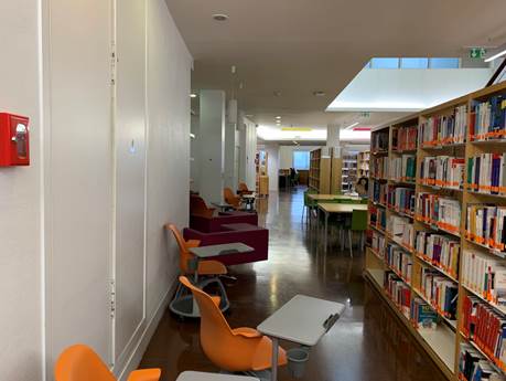这幢大楼麻雀虽小,五脏俱全,顶楼配置有设备与氛围俱优的图书馆,底层则有crous旗下的餐厅与咖啡馆,中庭广场旁有各学校社团的办公室,甚至还有一家学校专属旅行社。学校图书馆各种类型的座位数量充足且大多配备独立插头,很适合自习,馆内还有多间专门的讨论室与网络阅览室,适合多种学习需要。透过图书馆的窗户还能眺望到布洛涅森林、拉德芳斯、凯旋门、蒙马特高地与埃菲尔铁塔等名胜,令人心旷神怡。图书馆的藏书虽也丰富,大多却是法文书,因此我也就只能翻看翻看各类地图册地图集了。与优秀的图书馆相比教室的设施就显得比较一般,大致与四教齐平,毕竟是北约成立时期的老建筑了嘛!