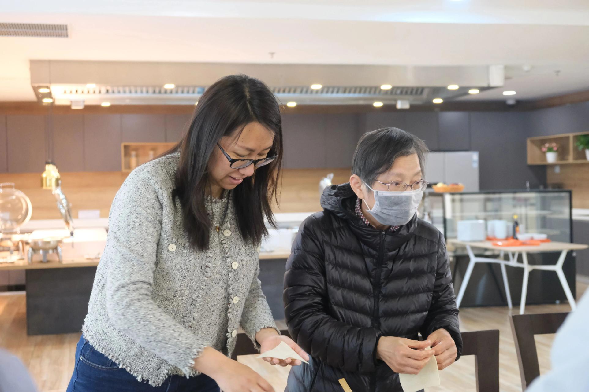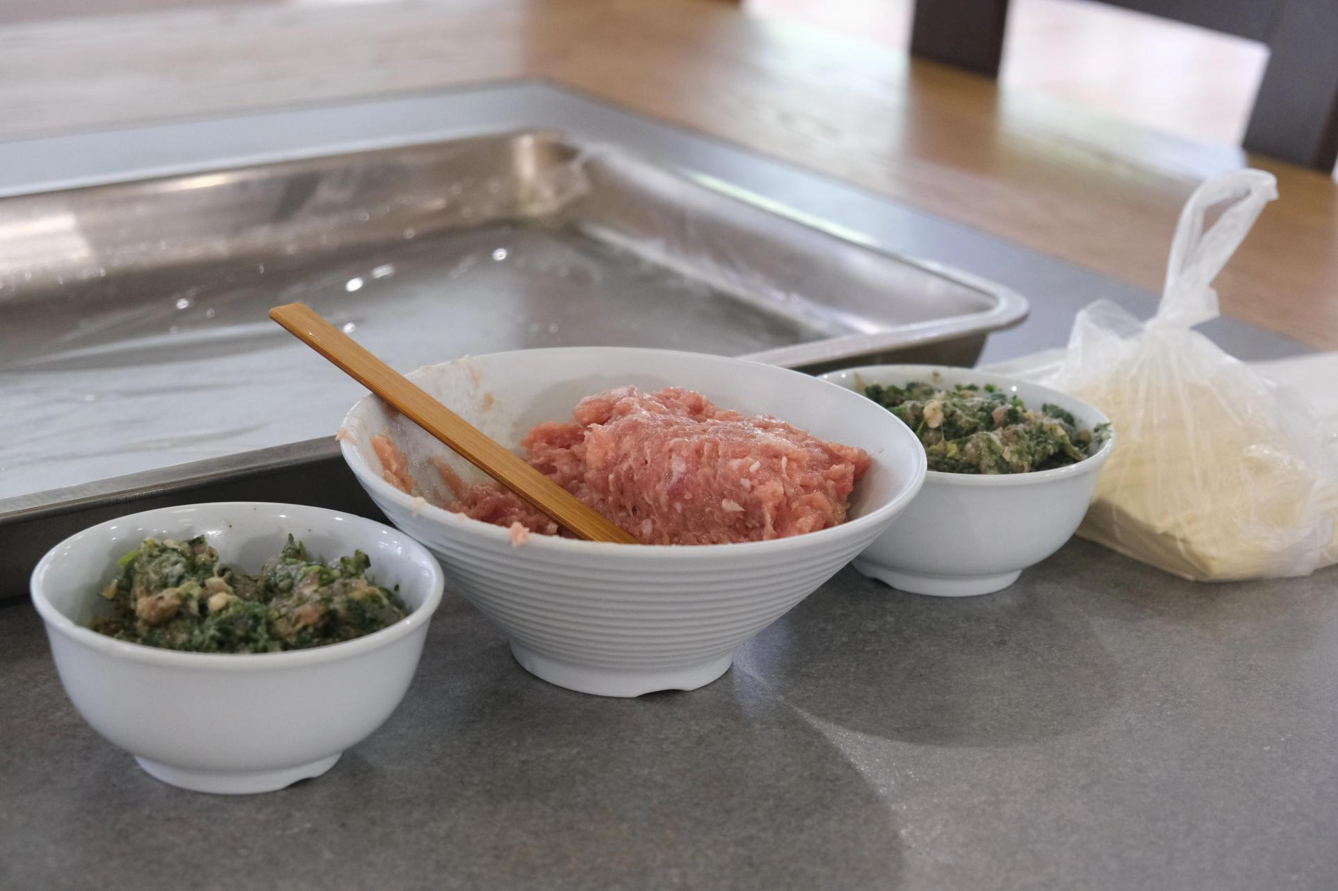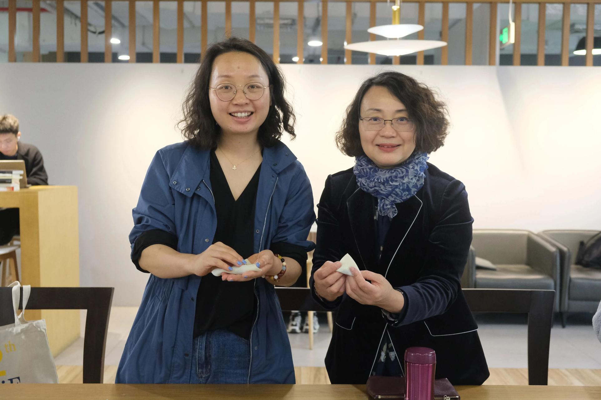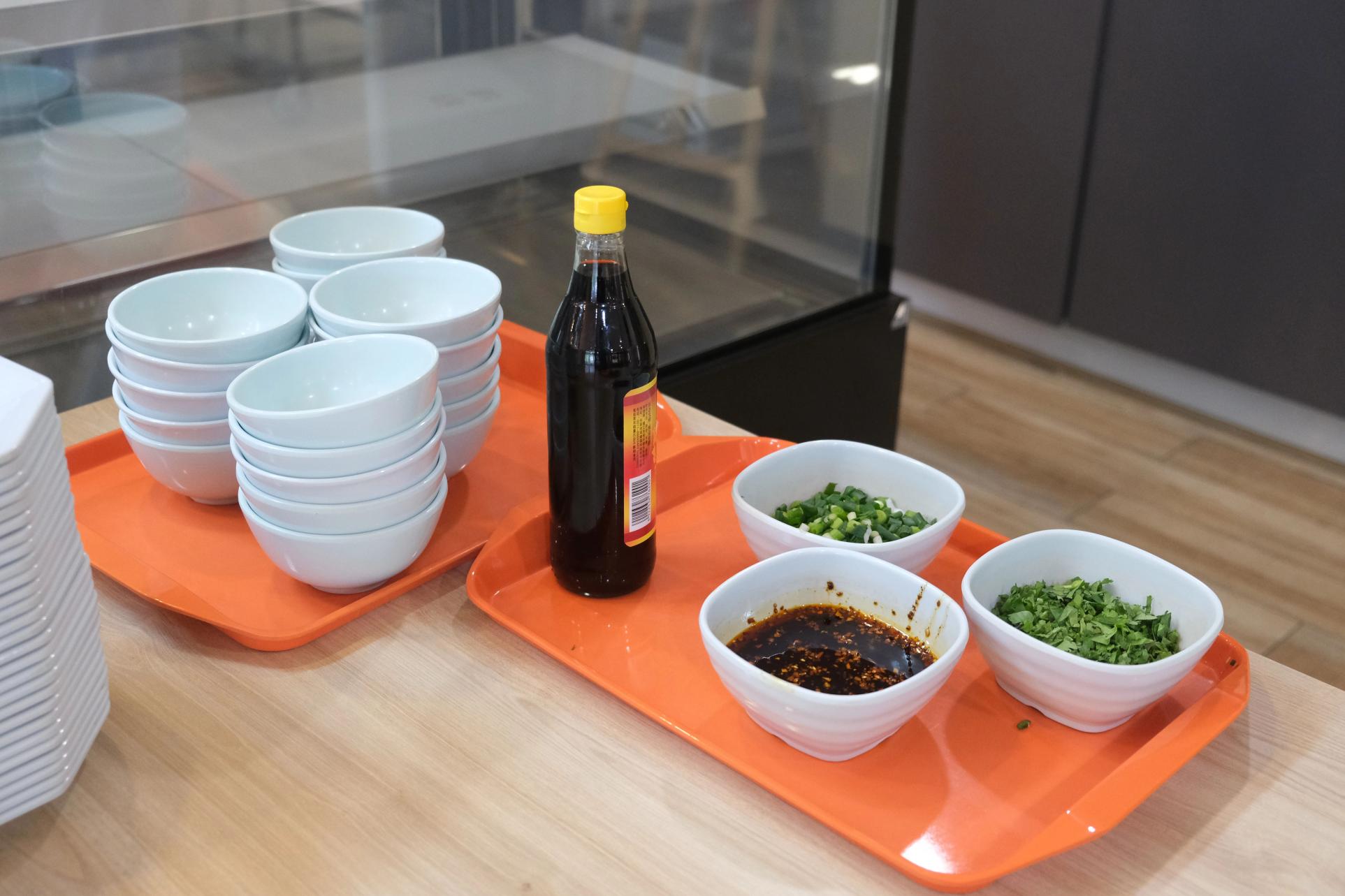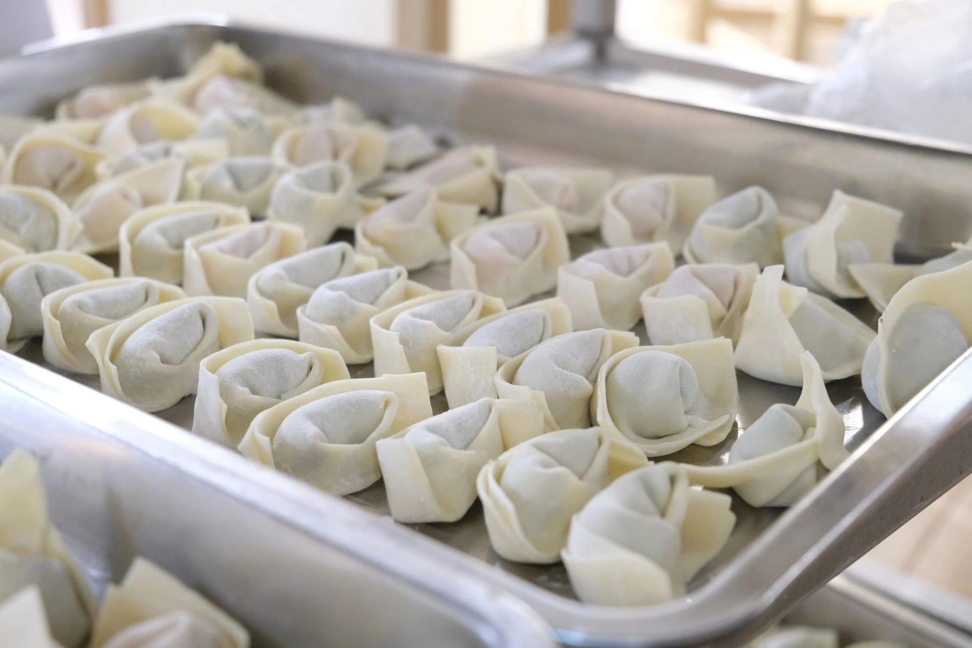 来到食堂,工作人员已提前准备好了馄饨皮、新鲜馅料和丰富的调味品。教职工们来到餐厅,洗净手,纷纷向身边的包馄饨“小能手”同事学习起了包法。