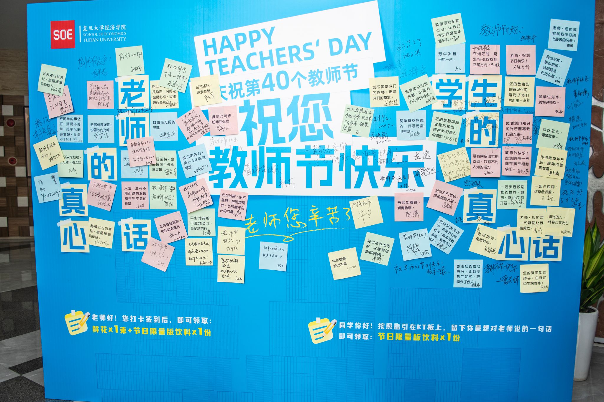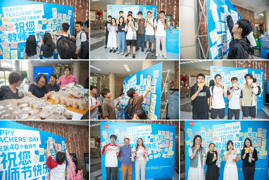 为了营造温馨的节日氛围,增进师生之间的情感联系,学院工会早早地在一楼大厅布置了节日特色美陈,包含师生互动留言区、节日限定饮料供应区,旨在打造一个集视觉享受、味觉体验与情感交流于一体的互动空间。在师生互动留言区,同学们笔墨生情,感念师恩,通过亲手书写的文字,向老师们传递了无尽的感谢和真挚的心意。老师们也纷纷留下寄语,勉励学生争做爱党爱国、自立自强、奋发向上的新时代新青年。师生们在这里自由交流,拍照留念,共同记录下这份难得的欢聚时光,让欢笑与温馨成为这个节日最动人的注脚。