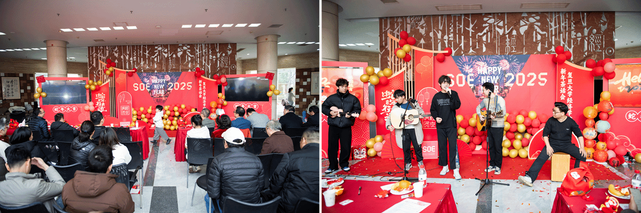 新生力量的热情与朝气。茶话会上还特别设置了“灵蛇送福奖”等抽奖环节,让现场充满了欢声笑语。欢送环节,退休教师代表周翼老师和童庆莲老师回顾了自己的职业生涯,并表达了对学院深厚的感激与祝福。随后,周翼老师以一曲深情的《弯弯的月亮》,将对学院的眷恋融入动人的旋律中。