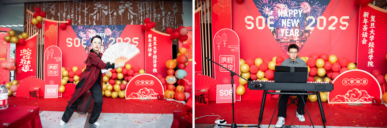 精彩纷呈,高潮迭起。特别节目《千年等一回》以合唱和舞蛇表演的独特形式,让观众耳目一新,掌声不断。紧接着,张金清老师的独唱《天路》用高亢激昂的歌声描绘了壮美的追梦之路,赢得满堂喝彩。博士生吕一伟的钢琴独奏《致艾德琳的诗》以柔美的旋律为观众带来片刻静谧。何文洁老师带来的扇子舞优雅灵动地展现了传统文化的魅力。