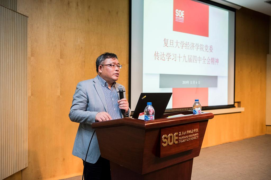 陈诗一要求全院师生认真学习十九届四中全会的精神,准确把握《决定》的各项具体内容,把学习四中全会精神作为主题教育学习的重要内容,重在学会贯通,把四中全会精神融汇于实际的工作和学习中。如《决定》所述,实践证明,中国特色社会主义制度和国家治理体系是以马克思主义为指导、植根中国大地、具有深厚中华文化根基、深得人民拥护的制度和治理体系,是具有强大生命力和巨大优越性的制度和治理体系,是能够持续推动拥有近十四亿人口大国进步和发展、确保拥有五千多年文明史的中华民族实现“两个一百年”奋斗目标进而实现伟大复兴的制度和治理体系。我们要把牢方向、抓住根本,必须坚持以马克思列宁主义、毛泽东思想、邓小平理论、“三个代表”重要思想、科学发展观、习近平新时代中国特色社会主义思想为指导,增强“四个意识”、坚定“四个自信”、做到“两个维护”,坚持党的领导,坚持和完善中国特色社会主义制度、推进国家治理体系和治理能力现代化,把我国的制度优势更好转化为国家治理效能,为实现“两个一百年”奋斗目标和实现中华民族伟大复兴的中国梦提供有力保证。陈诗一要求各位党员师生、各支部就四中全会精神学习展开讨论,交流心得,通过深入的学习不断促进学院各项工作的开展,促进个人素养的不断提升。