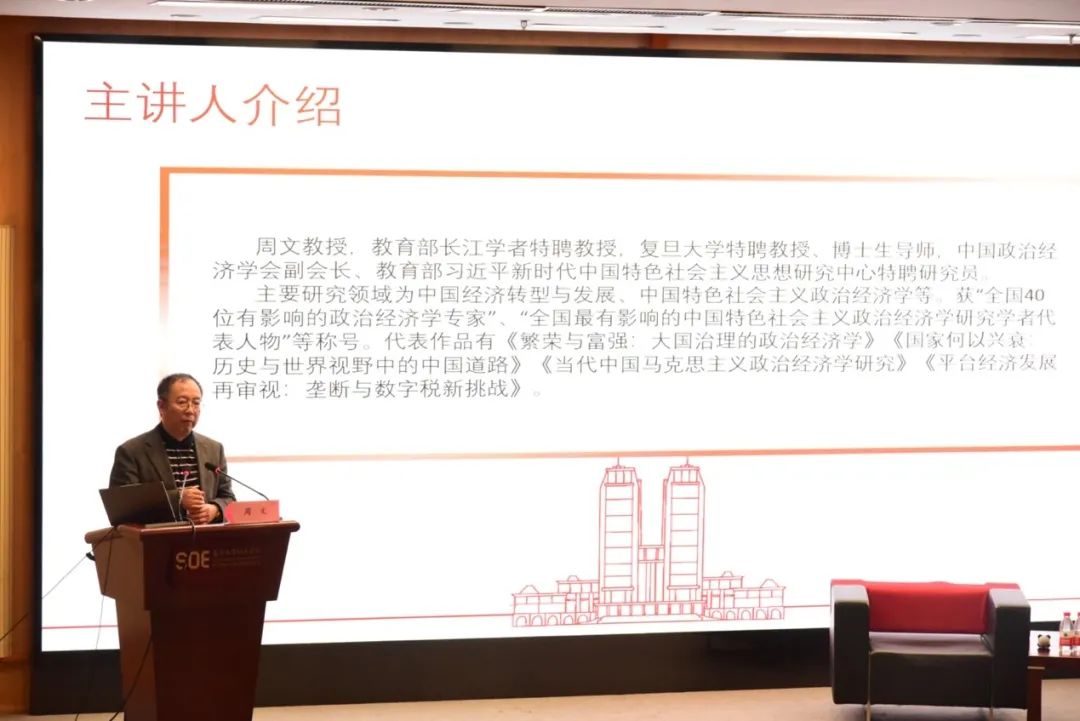 讲座伊始,周文教授首先对建党百年以来我国所取得的经济成就进行了总结回顾,分中国共产党建立、新中国成立以及党的十八大三个阶段讲述了我国砥砺奋进的历史及取得的伟大成果,并结合二十大报告对未来中国经济的发展提出了展望。