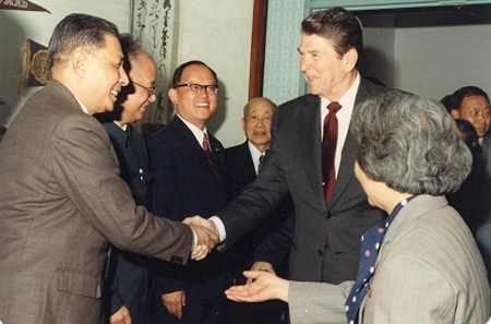 时会见苏步青、谢希德、谈家桢、华中一、蒋学模等教授,右图为经济学系蒋学模教授(左一)与里根总统握手。
