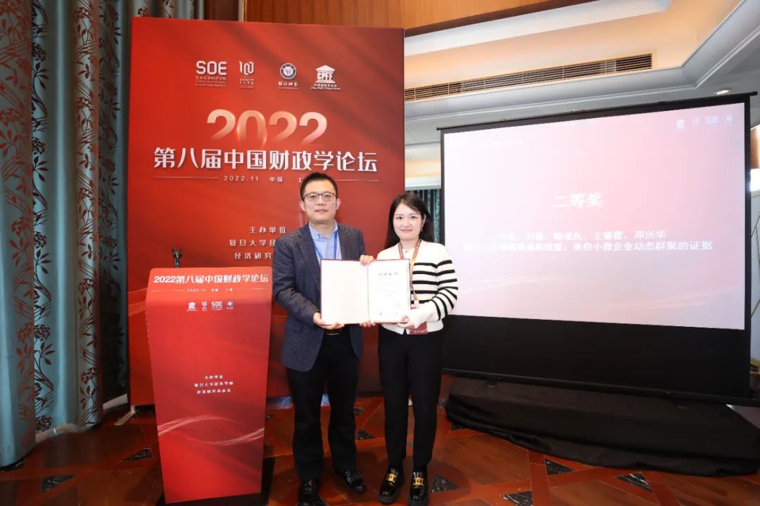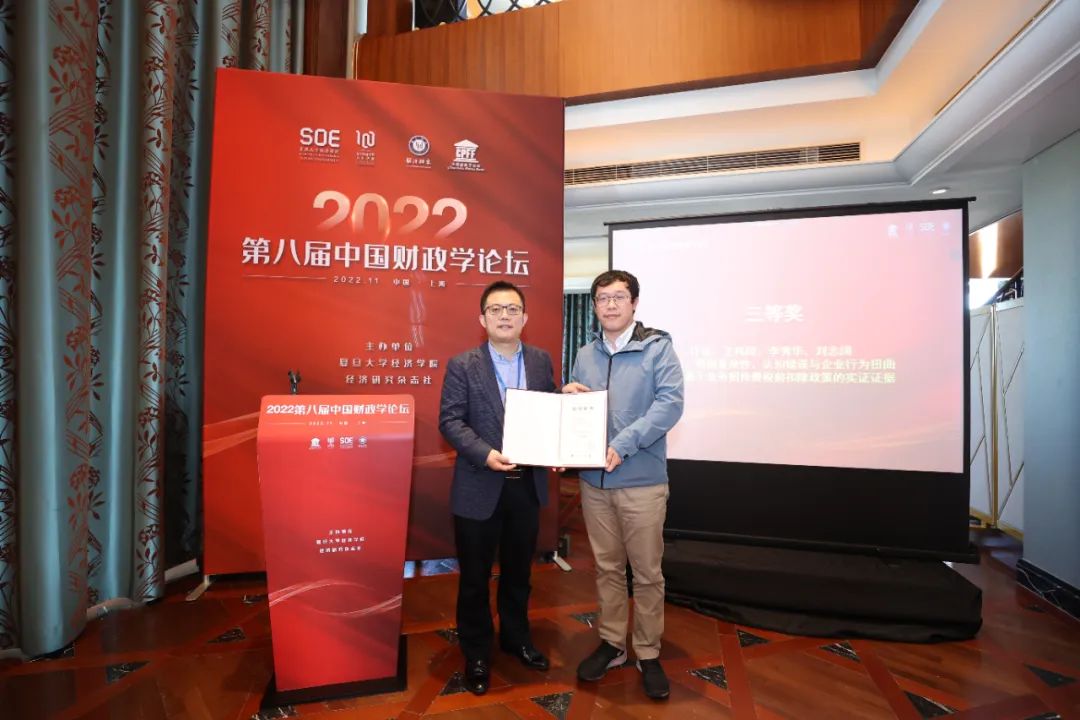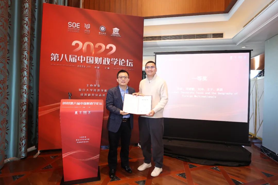 副院长寇宗来教授宣布本届优秀论文获奖名单。邓建鹏、刘冲、王子、资源的论文《Local Corporate Taxes and the Geography of Foreign Multinationals》获得一等奖;刘蓉、陈凌庆、王睿霆、邓兴华的论文《从预算要减税效能:来自小微企业动态群聚的证据》获得二等奖;王伟同、李秀华、刘志阔的论文《税制复杂性、认知错误与企业行为扭曲——基于业务招待费税前扣除政策的实证证据》与张子尧和尹恒的论文《社会保险缴费率差异与资源配置效率》获得三等奖。最后,中央财经大学姚东旻教授代表第九届论坛主办单位发言。