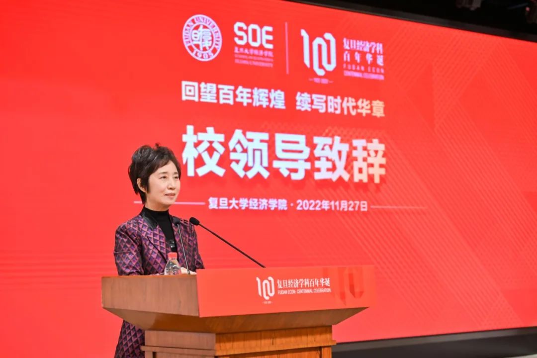 院长代表和复旦经院学生的双重身份祝贺复旦经济学科百年华诞,表示将与复旦经济学科携手共进,一起构建中国风格、中国特色、中国气派的中国经济学。