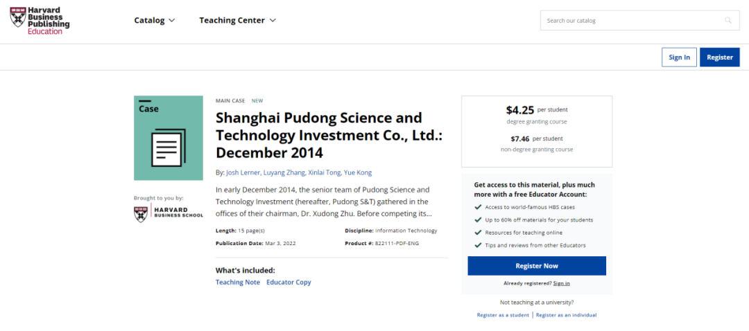 张陆洋教授带领他的硕士研究生童鑫来和博士研究生孔玥,自2019年起,历时两年多撰写的关于“上海浦东科技投资有限公司”的教学案例,于2022年5月正式被哈佛大学商学院收录为教学案例(见图1和图2)。这是御书屋