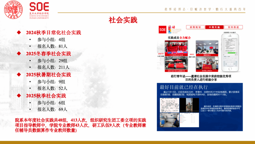 统筹推进社会实践与志愿服务。年度立项社会实践项目48组,参与413人次,并通过“经行青年说”等活动强化经验传播与育人实效。志愿服务方面,为献血、生涯论坛、毕业典礼、博士生论坛及学院40周年系列活动等提供保障,累计组织志愿者274人次。同时,圆满完成学院第三十次研究生代表大会会务工作,组织选举产生校级研代会代表。