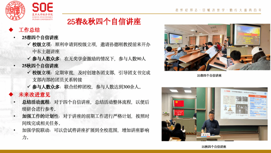 紧密围绕思想引领与组织保障两条主线开展工作。顺利完成“四个自信”系列讲座春季校级立项,邀请孙德刚教授主讲中东专题,参与90人次;秋季讲座进一步规范流程,与经粹团校联合举办,覆盖300余人次。日常工作中,高效完成财务报销、决算预算编制,并协同完成研会与博士生讲师团招新,为组织平稳运行提供了坚实支撑。