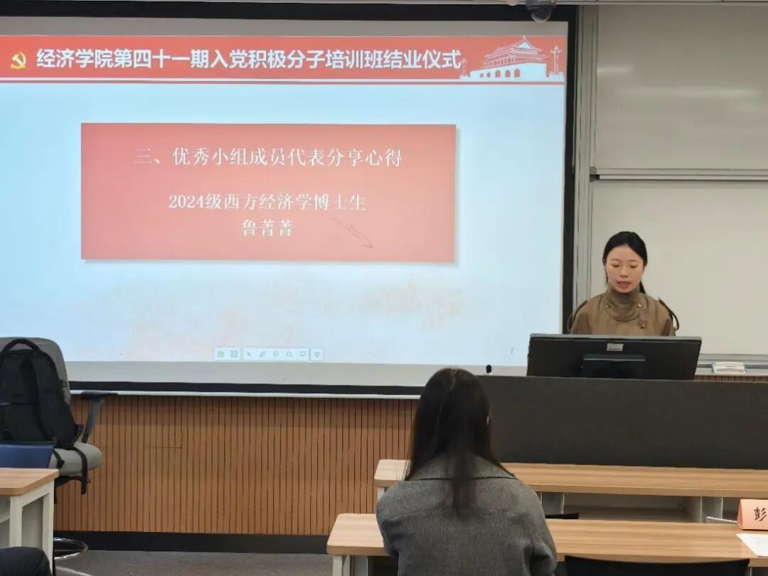 随后,本期培训班优秀学员代表谢沁宜同学进行了发言,分享了她参加培训班的学习收获与感悟。她表示自己通过专家理论授课、红色实践参访和小组研讨交流深刻领悟了党的初心使命与理论创新,坚定了“为人民服务”的理想信念,并结合经济学科特色强调新时代青年应肩负“经世济民”的责任担当。她以“功成不必在我,功成必定有我”的精神自勉,承诺将继续以党员标准严格要求自己,将培训所学转化为服务国家发展的实际行动,争取早日成为一名合格的共产党员。
