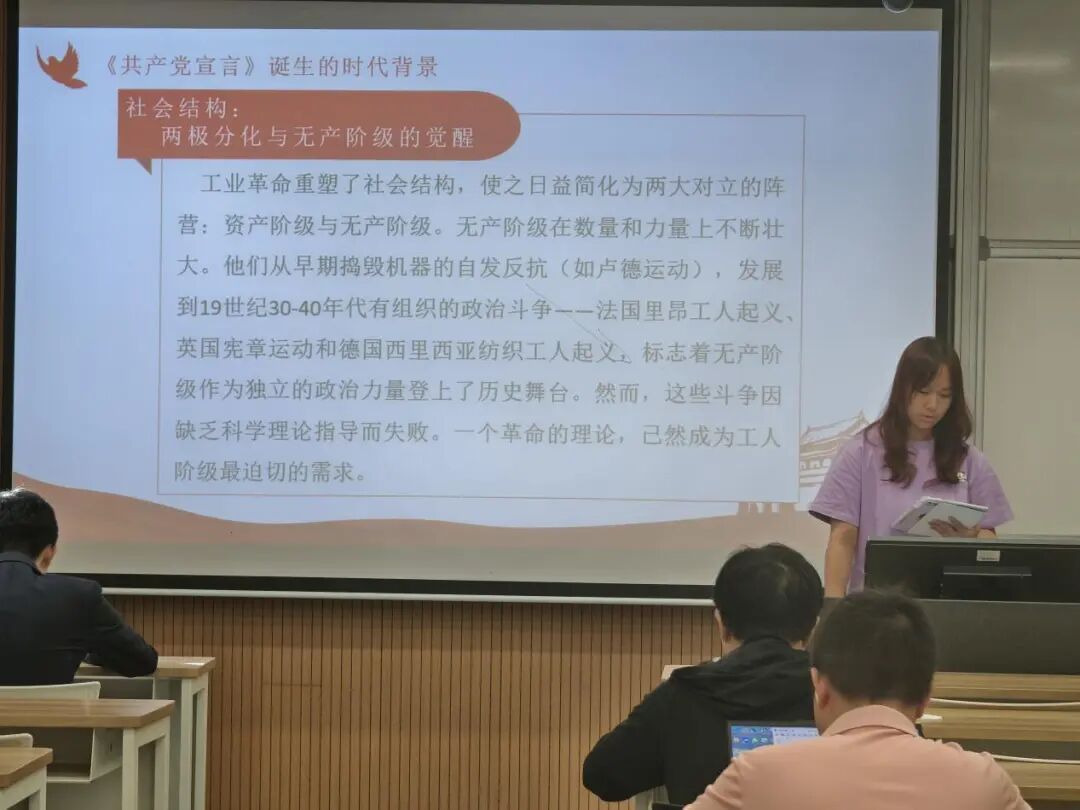 本次入党积极分子培训班设置了《共产党宣言》作为读书研讨书目。学员们就阅读《共产党宣言》并进行小组讨论的成果进行了分组汇报。第一组同学的汇报主题为《真理之光,时代之鉴—<共产党宣言>研读:从时代背景到当代指引》,他们从《共产党宣言》诞生的时代背景引入,探讨了《共产党宣言》的核心内涵并分析了《共产党宣言》的当代指导价值。第二组同学的汇报主题为《<共产党宣言>的核心要义与新时代青年的使命担当》,他们从理论基石、精神品格、思想洗礼与行动宣言四个方面阐述了当代青年应当如何在《共产党宣言》的指导下践行自己的使命担当。第三组同学的汇报主题为《<共产党宣言>经典理论的当代价值与实践》,他们将《共产党宣言》的核心思想与当代中国实践结合起来,讨论了其对个人成长与责任的启示。第四组同学的汇报主题为《以<共产党宣言>为灯,在研究中锤炼初心》,他们以社会主义改革、全球分工、产业政策、共同富裕等当代中国经济发展的重要概念,阐述了《共产党宣言》的时代价值,展示了他们对于这本经典著作深刻而又独到的理解。第五组同学的汇报主题为《不忘初心、牢记使命》,他们介绍了《共产党宣言》对个人与时代的意义,从经济学视角出发总结了阅读收获,并从专业学习、关注现实、个人成长三个维度总结了《共产党宣言》的实践意义。