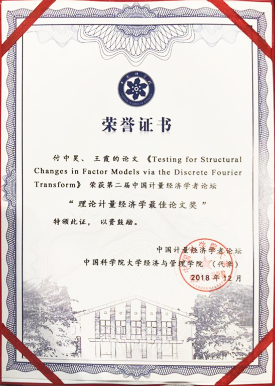 付中昊、王霞的论文Testing for Structural Changes in Factor Models via the Discrete Fourier Transform荣获第二届中国计量经济学者论坛“理论计量经济学最佳论文奖...