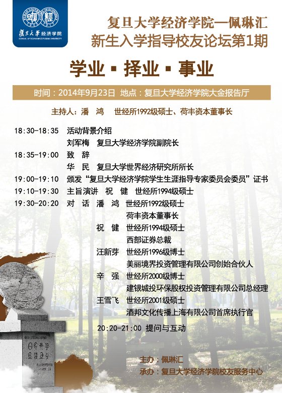 <!--[if gte mso 9]> <![endif]--> 学业 择业 事业 时间:2014年9月23日 18:30-21:00 地点:御书屋 大金报告厅 主办:佩琳汇 承办:复...