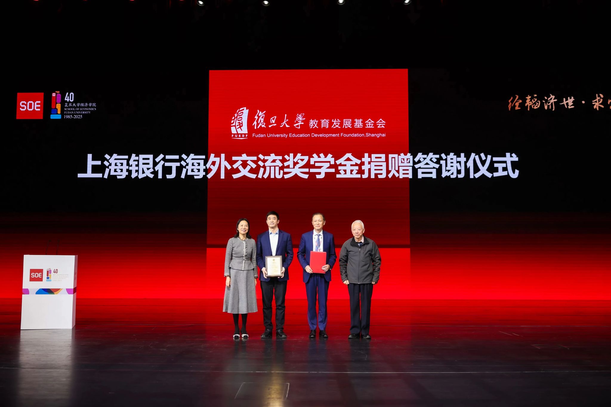 为助力更多优秀经院学子以此为起点走向世界舞台,大会举行了上海银行海外交流奖学金捐赠仪式。这份慷慨捐赠将化作托举学子飞向世界的翅膀,支持他们开拓国际视野。上海银行党委书记、董事长顾建忠深情回忆了在复旦经院求学的时光。他表示,复旦的培养与师长的言传身教是受益一生的财富,如今能以金融力量反哺母校,不仅是感恩,更是一份沉甸甸的责任。顾建忠介绍,该奖学金项目旨在资助经院学子赴海外留学深造,拓宽国际视野。他强调,上海银行始终秉持“金融让生活更美好”的初心,未来将继续深化与御书屋